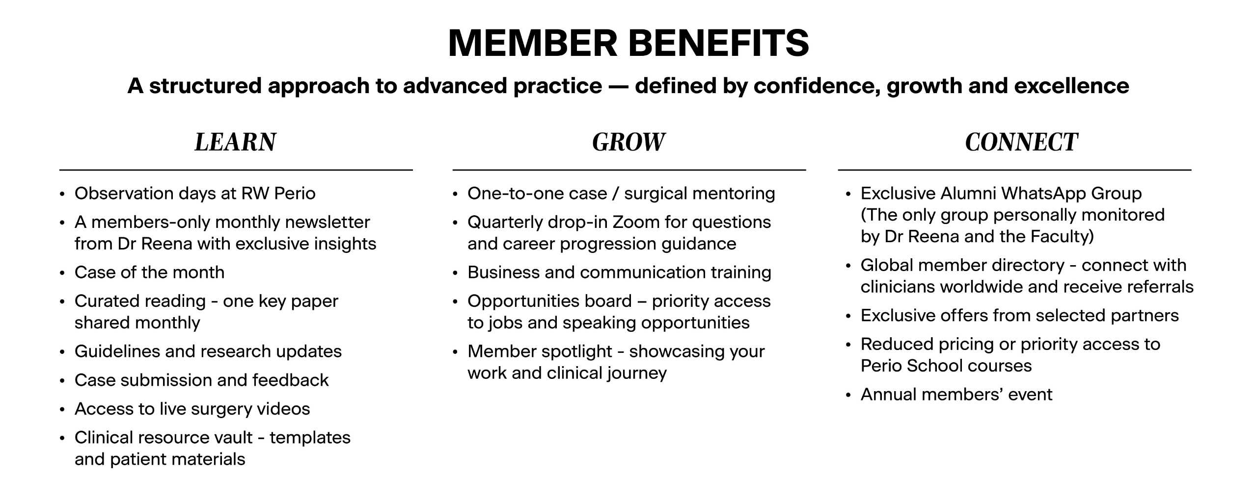 It brings together our global network of ambitious clinicians – creating a trusted space for guidance, discussion, and collaboration with Dr Reena and the wider Perio School Faculty.​